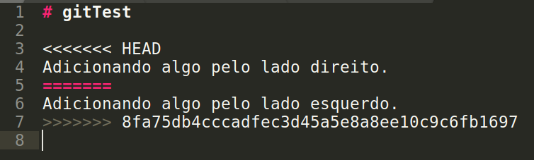 A mensagem Automatic merge failed; fix conflicts and then commit the result quer dizer que teremos que abrir os arquivos que resultaram em conflitos e deixá-los da maneira que eles devem ficar corretamente: