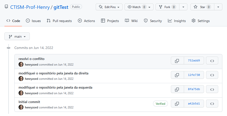 Pronto! Com isso, a resolução de conflito que acabamos de fazer estará presente no repositório remoto: